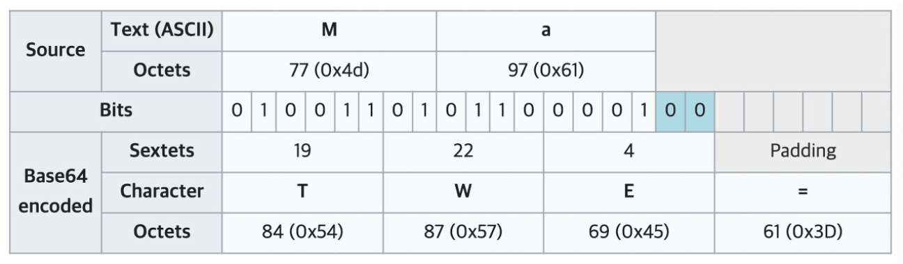 이렇게 base64로 인코딩된 문자는 A-Z, a-z, 0-9, +=/ 로 구성되며 특히 '=' 기호의 경우 부족한 비트 수를 채우는 padding문자이므로 인코딩된 문자열이 '~=' 로 끝나면 base64가 적용되었다고 유추 가능함