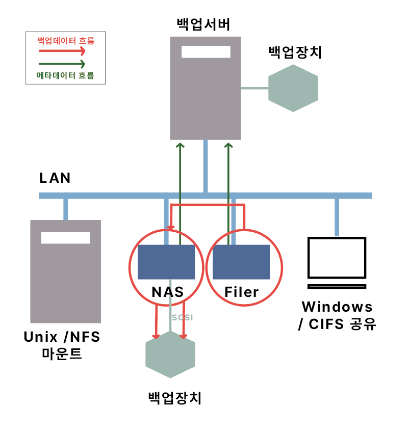 - 백업 서버는 네트워크 통해 NAS 파일시스템 백업이나 복구를 NAS 장비에 지시