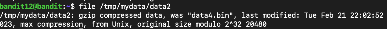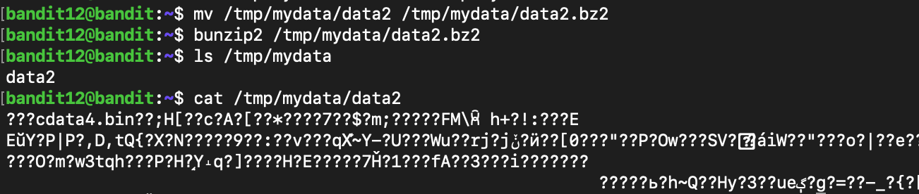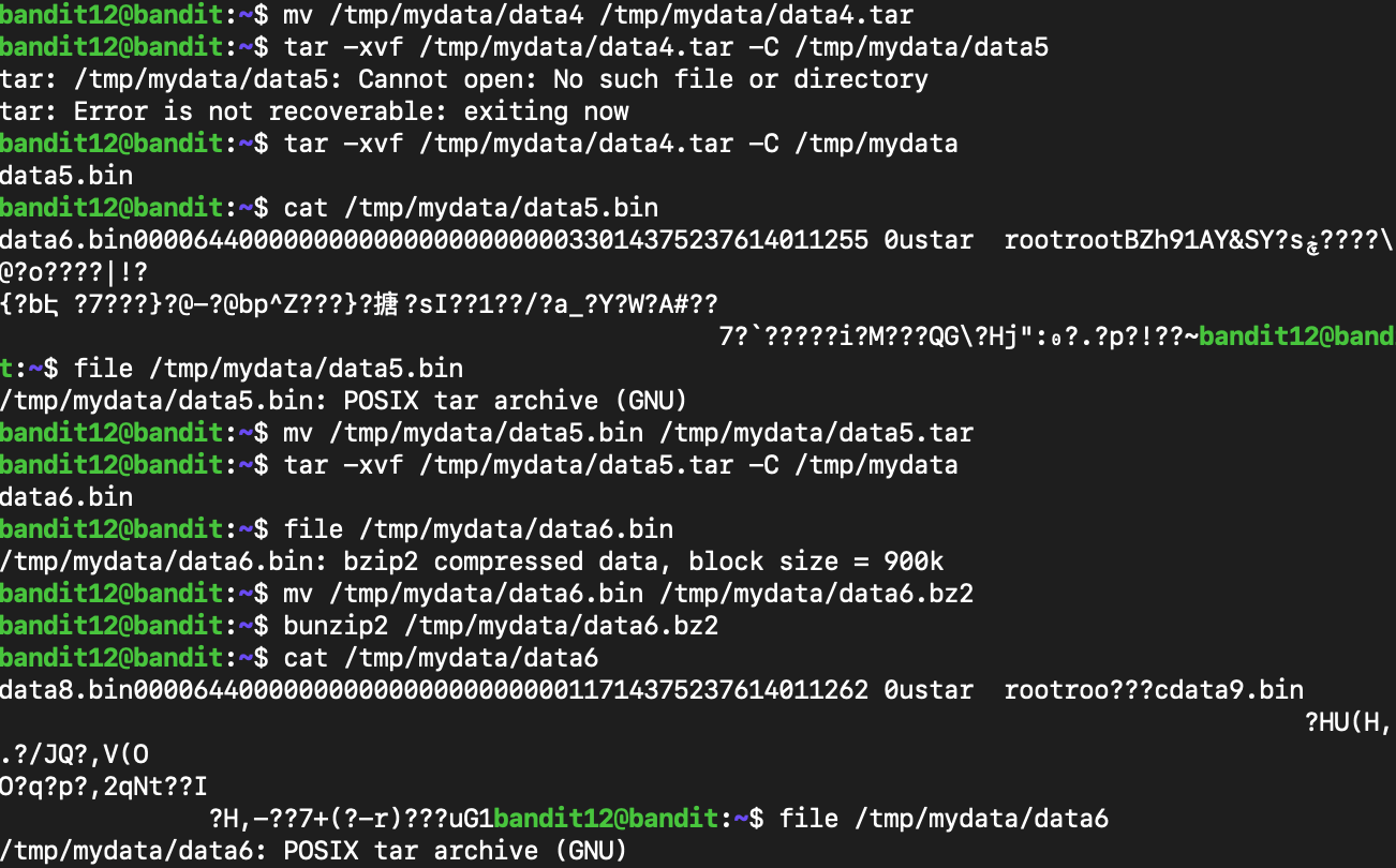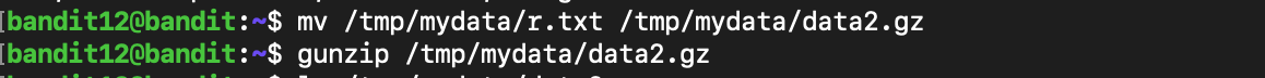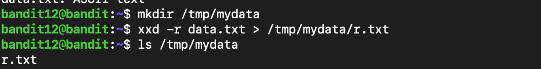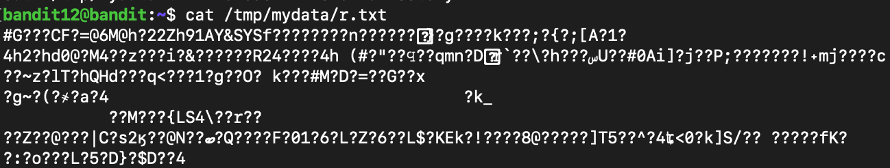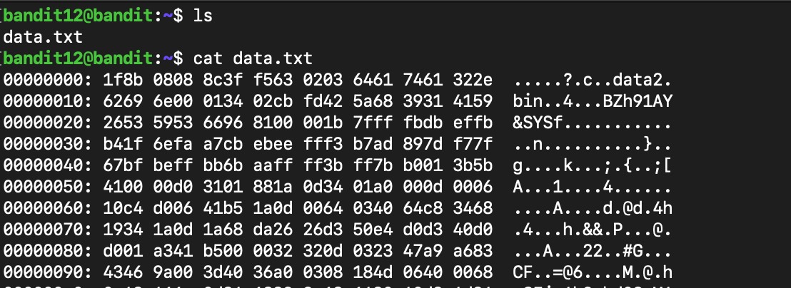 ✅ Level 12 : The password for the next level is stored in the file data.txt, which is a hexdump of a file that has been repeatedly compressed. For this level it may be useful to create a directory under /tmp in which you can work using mkdir. For example: mkdir /tmp/myname123. Then copy the datafile using cp. And rename it using mv