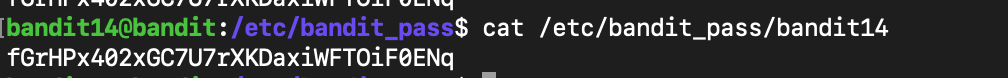 bandit14 서버 접속에 성공 했고, 암호가 있다는 /etc/bandit_pass/bandti14 파일에서 cat 명령으로 암호 획득함
