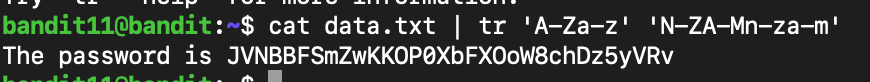 ✅ Level 11 : The password for the next level is stored in the file data.txt, where all lowercase (a-z) and uppercase (A-Z) letters have been rotated by 13 positions