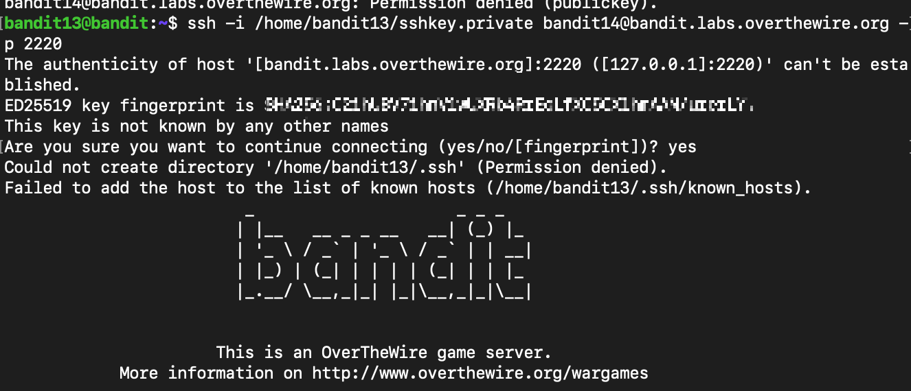 ✅ Level 13 : The password for the next level is stored in /etc/bandit_pass/bandit14 and can only be read by user bandit14. For this level, you don't get the next password, but youget a private SSH key that can be used to log into the next level. Note : localhost is a hostname that refers to the machine you are working on