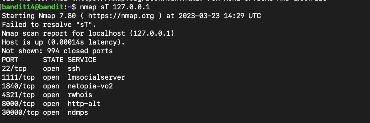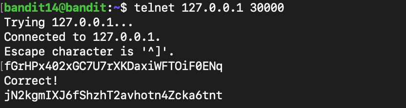 ✅ Level 14 : The password for the next level can be retrieved by submitting the password of the current level to port 30000 on localhost