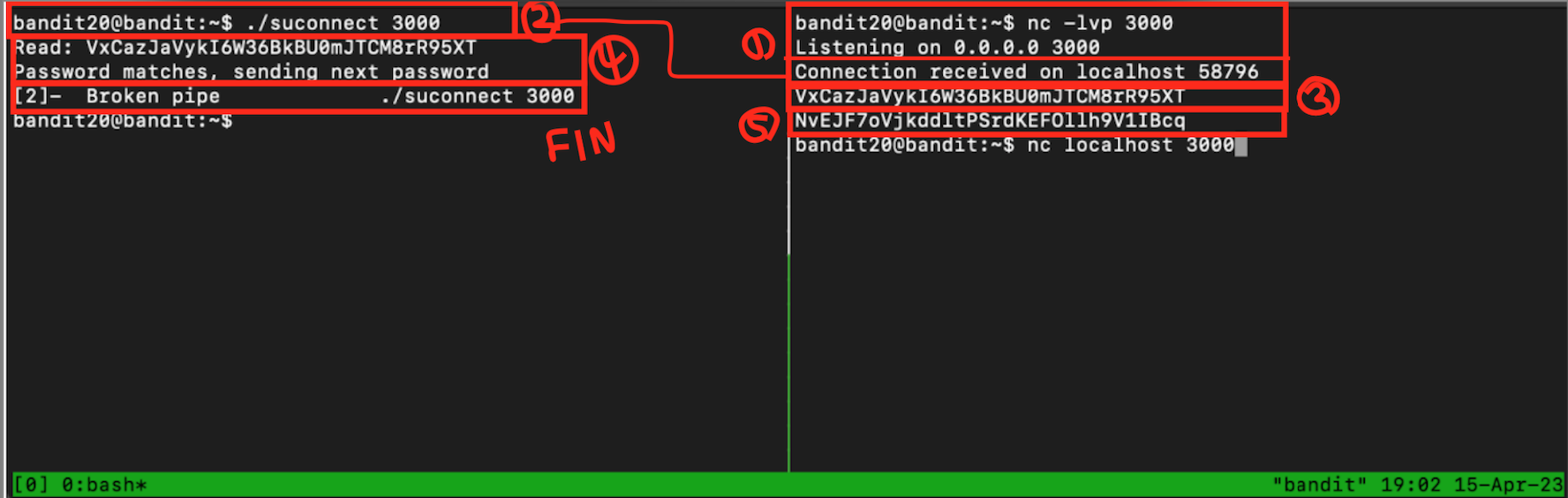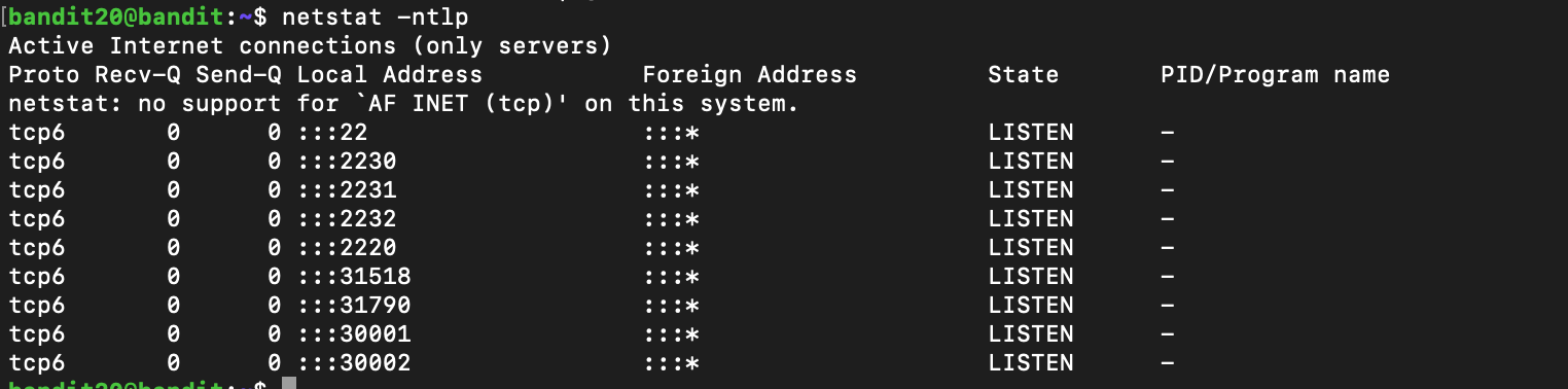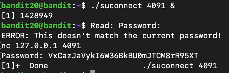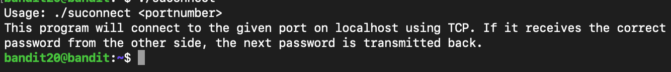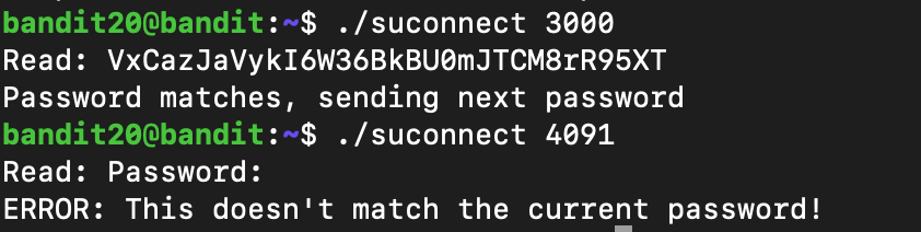 ✅ Level 20 : There is a setuid binary in the homedirectory that does the following: it makes a connection to localhost on the port you specify as a commandline argument. It then reads a line of text from the connection and compares it to the password in the previous level (bandit20). If the password is correct, it will transmit the password for the next level (bandit21).