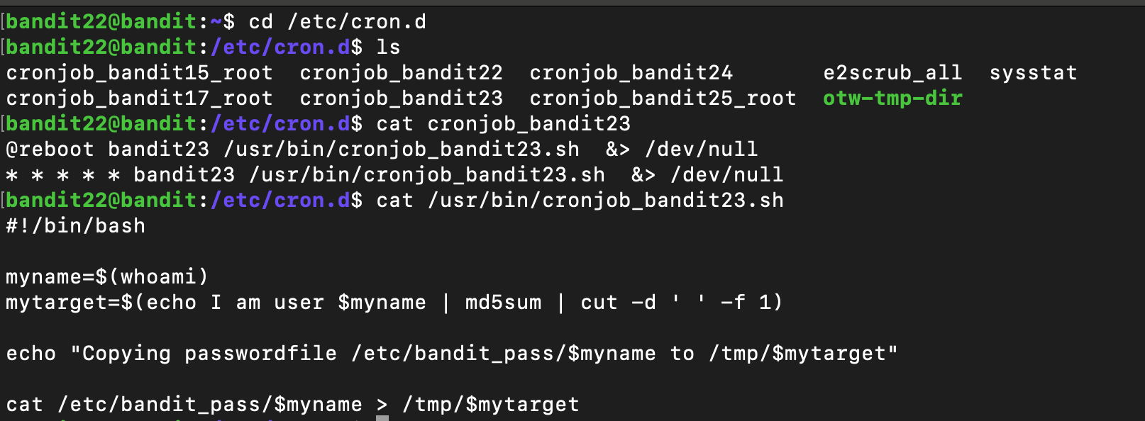 따라서 현재 cat /etc/bandit_pass/bandit23 실행 권한은 막혀있지만 평문 'I am user bandit23' 을 md5sum 해시값으로 바꿔서 cat /tmp/(hash 값)으로 실행하면 bandit23 암호 얻을 수 있을 것으로 예상됨