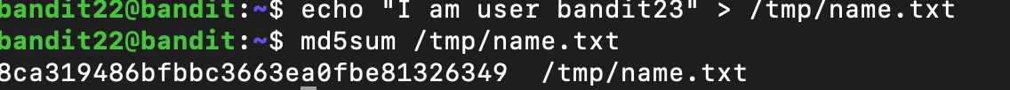 평문을 임시폴더에(/tmp) 저장한 뒤 md5sum [파일명] 명령으로 bandit23에 대한 mytarget 값을 얻어냄