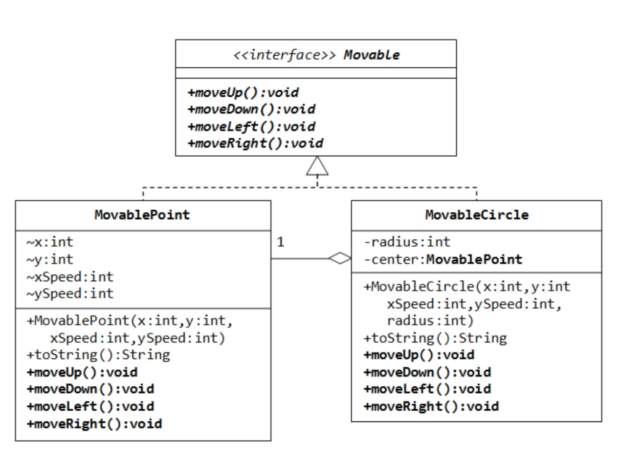 - 2) 인터페이스를 원으로 표기, 인터페이스 이름 명시(접두에 I or 접미에 able 붙임), 인터페이스와 클래스 사이 실선 연결
