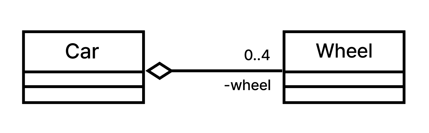 - 전체와 부분은 독립적, 따라서 부분 인스턴스는 다른 클래스와 공유될 수 있음